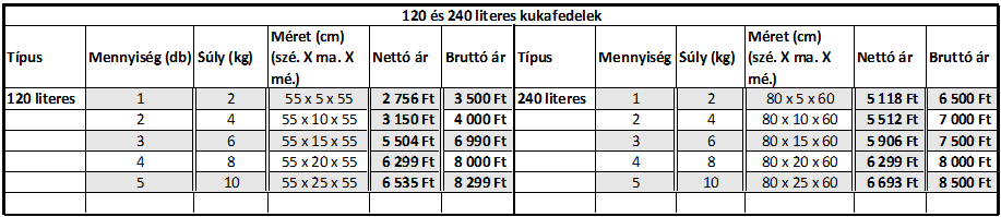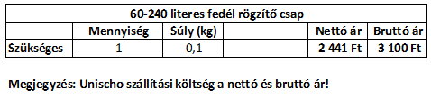 Az Unischo Kft-tól (2143 Kistarcsa, Raktár körút 3.) szállítandó kukák mérettáblázata és szállítási költségek